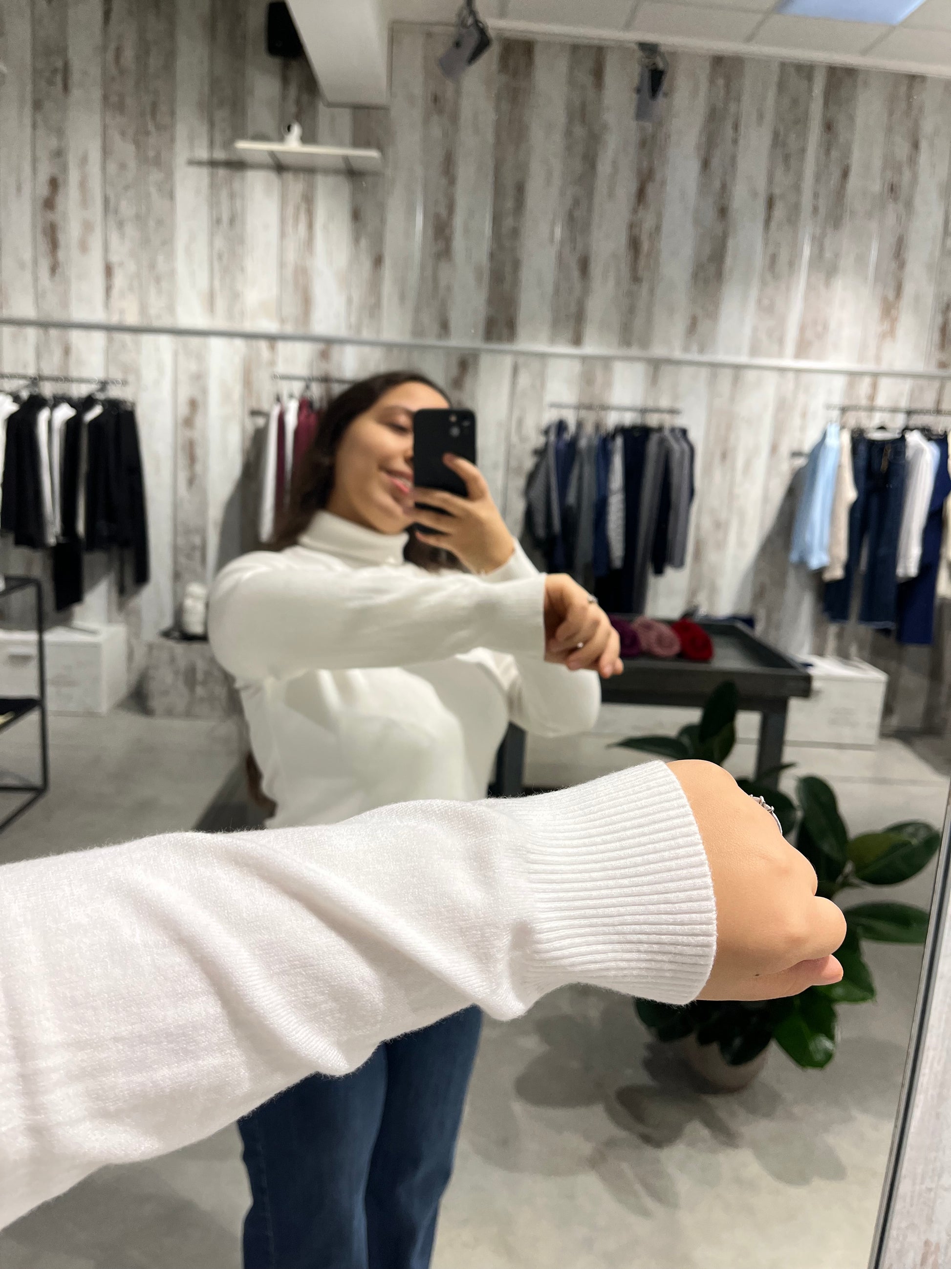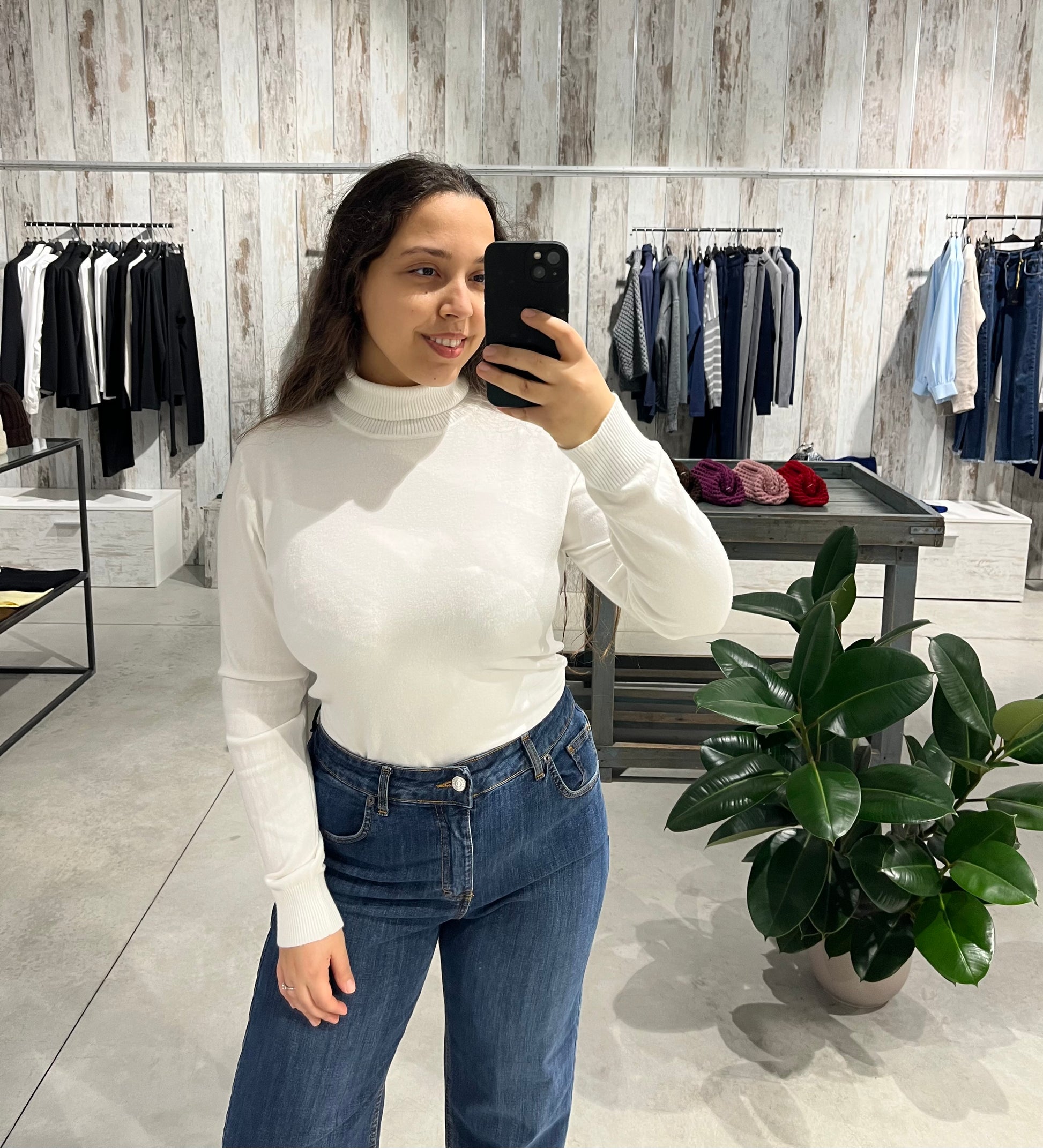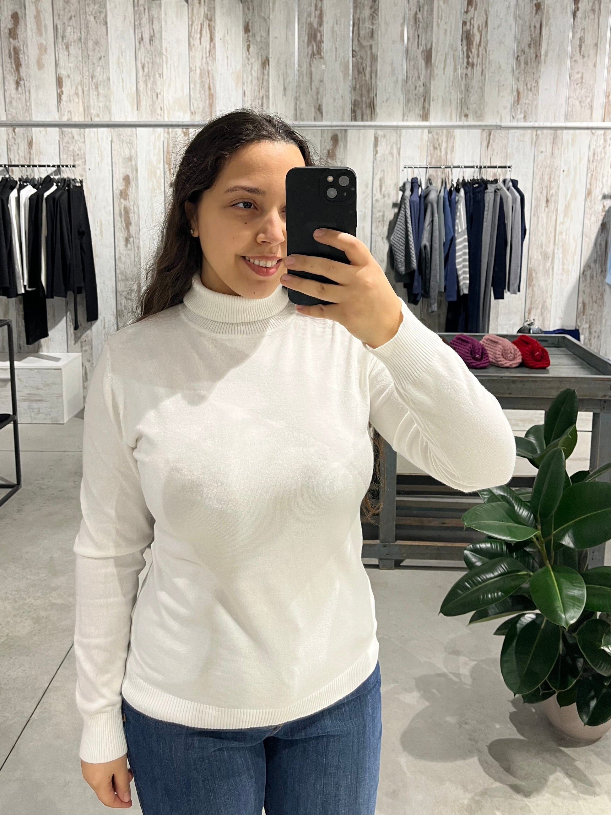 Dolcevita color bianco con vestibilità morbida, maniche lunghe e dettagli a costine.