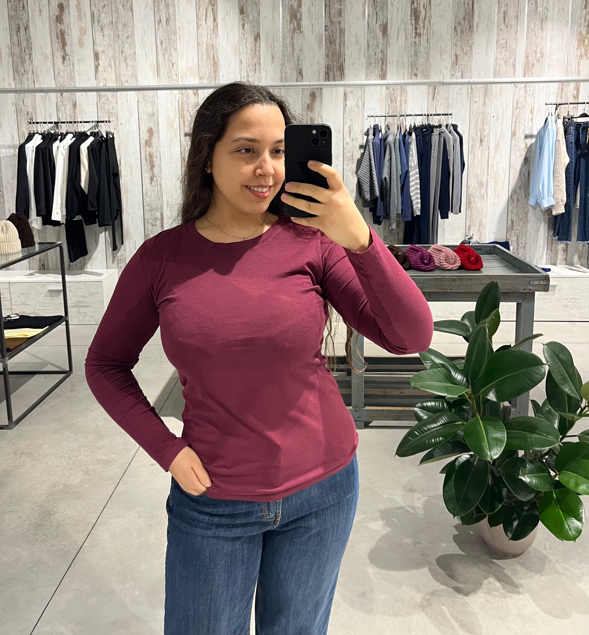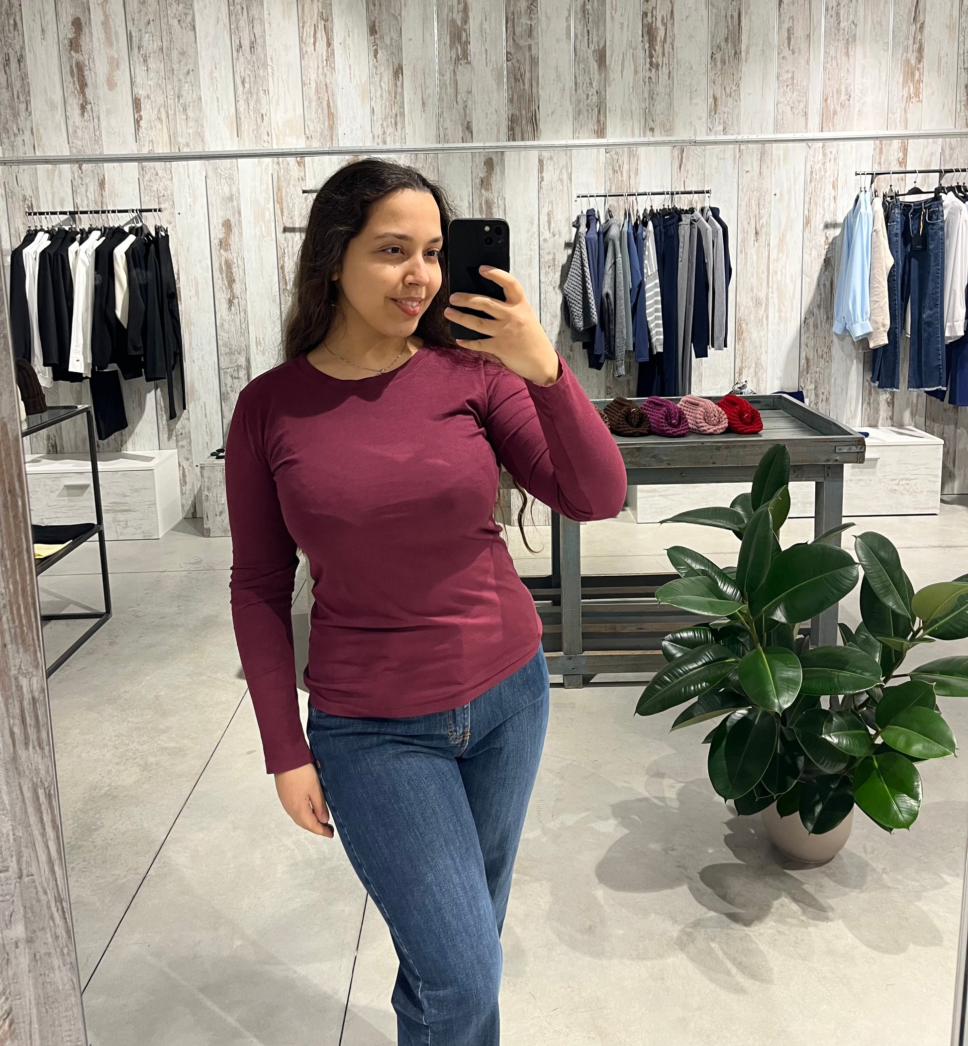 Maglia color bordeaux con vestibilità aderente, girocollo e maniche lunghe.