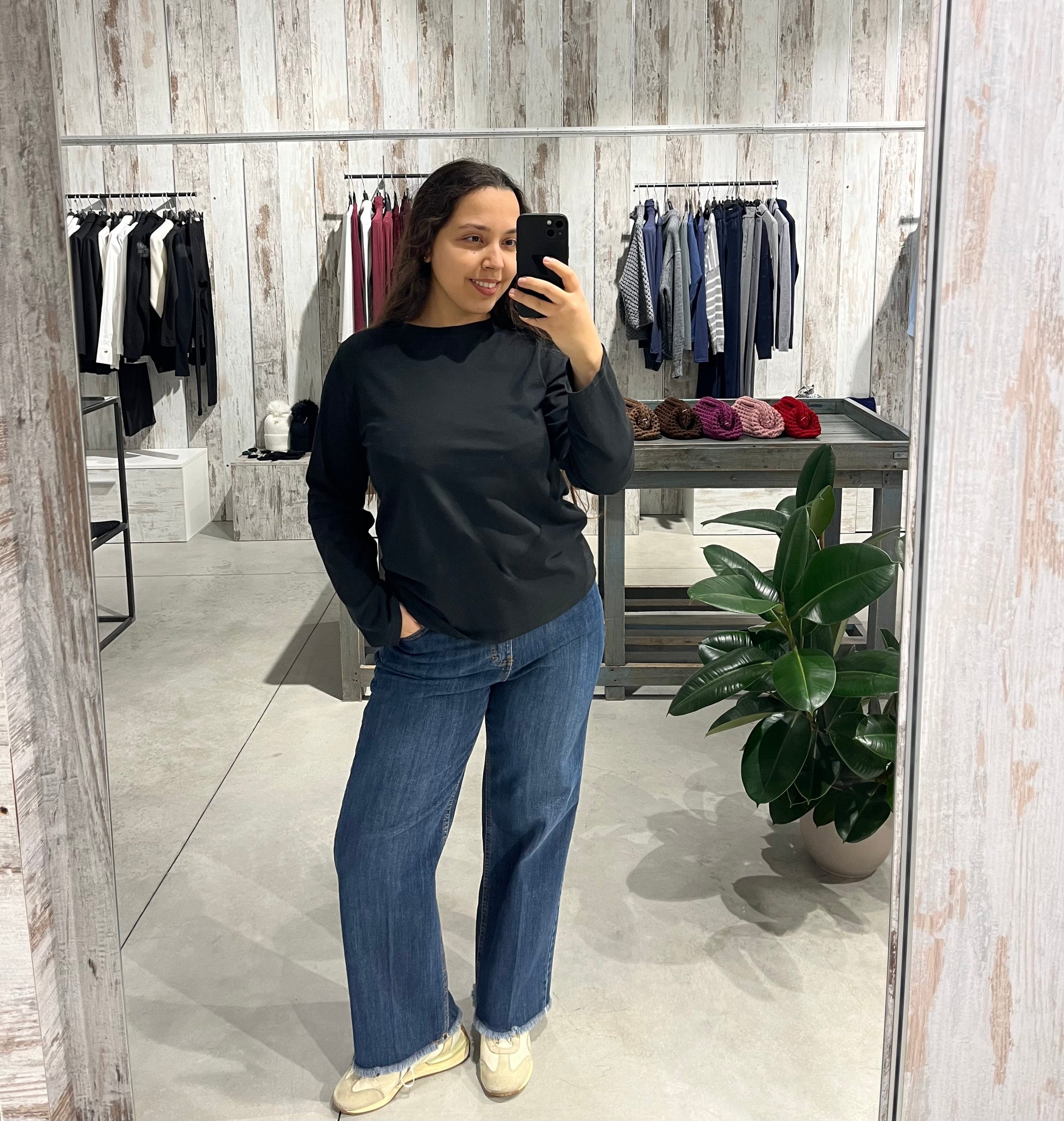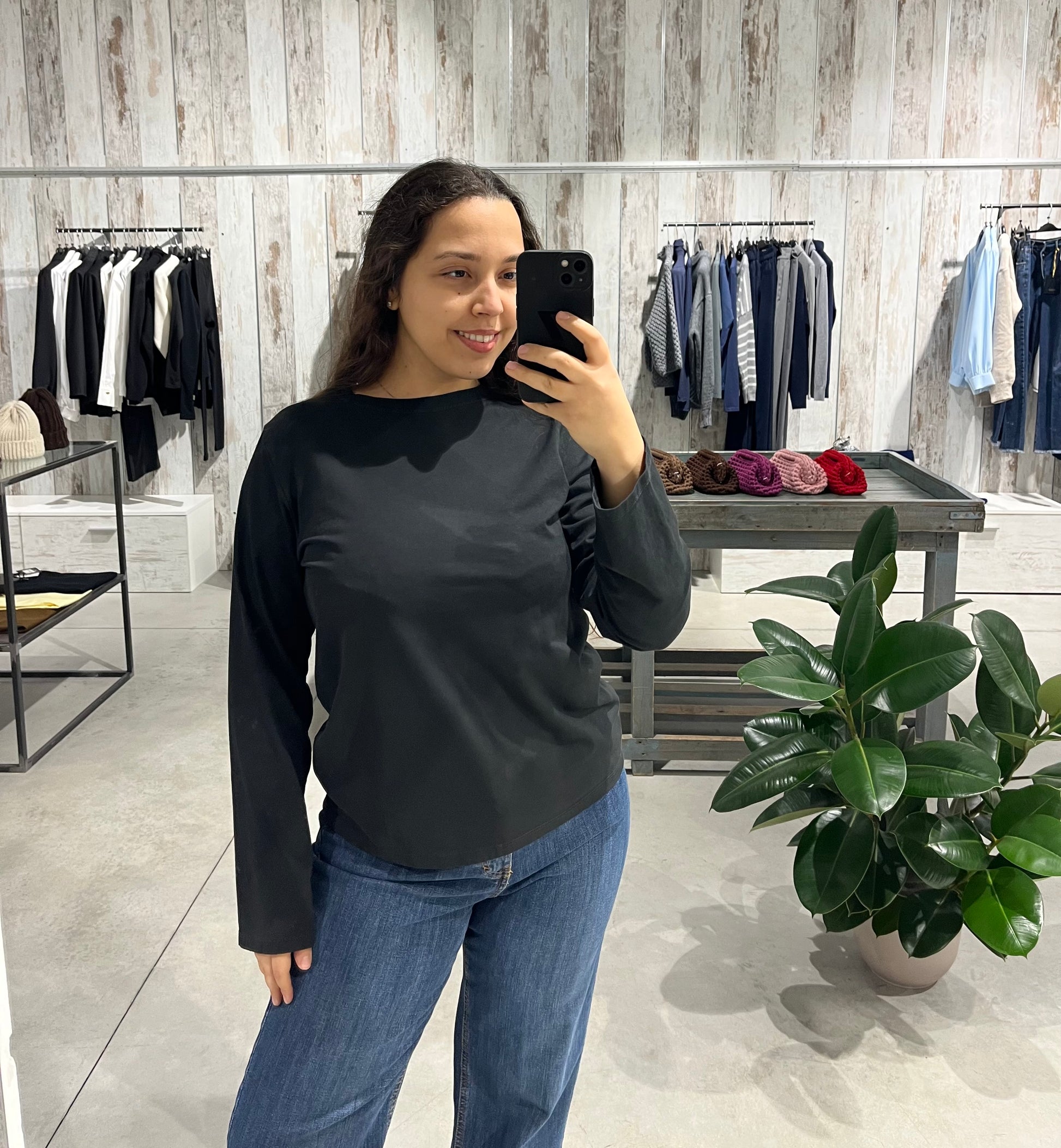 Maglia color nero con vestibilità morbida, girocollo e maniche lunghe.
